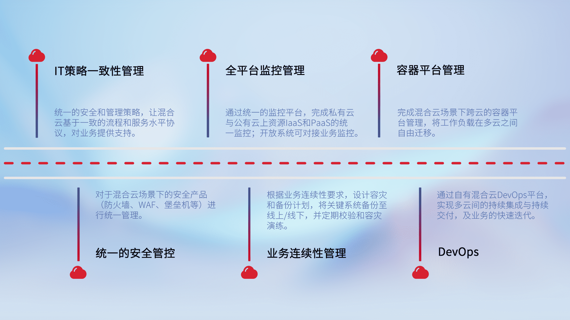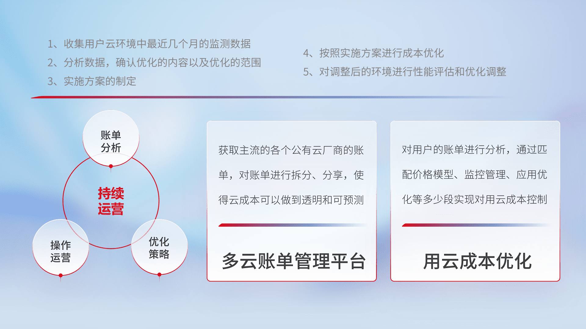 通过多云纳管,,,以统一的资源数据模型把客户的云资源进行抽象和封装,,进而实现对多云资源的统一操作,,,保障云资源管理的可靠性、、稳定性与可用性。。。。量身定制化运维内容,,,配置、、、、开发运维、、、、补丁管理、、、、备份、、、、监控、、、认证和访问管理、、、审计和日常巡检等,,,,保障在用云过程中的可靠度,,,,稳定度以及高可用率。。。。