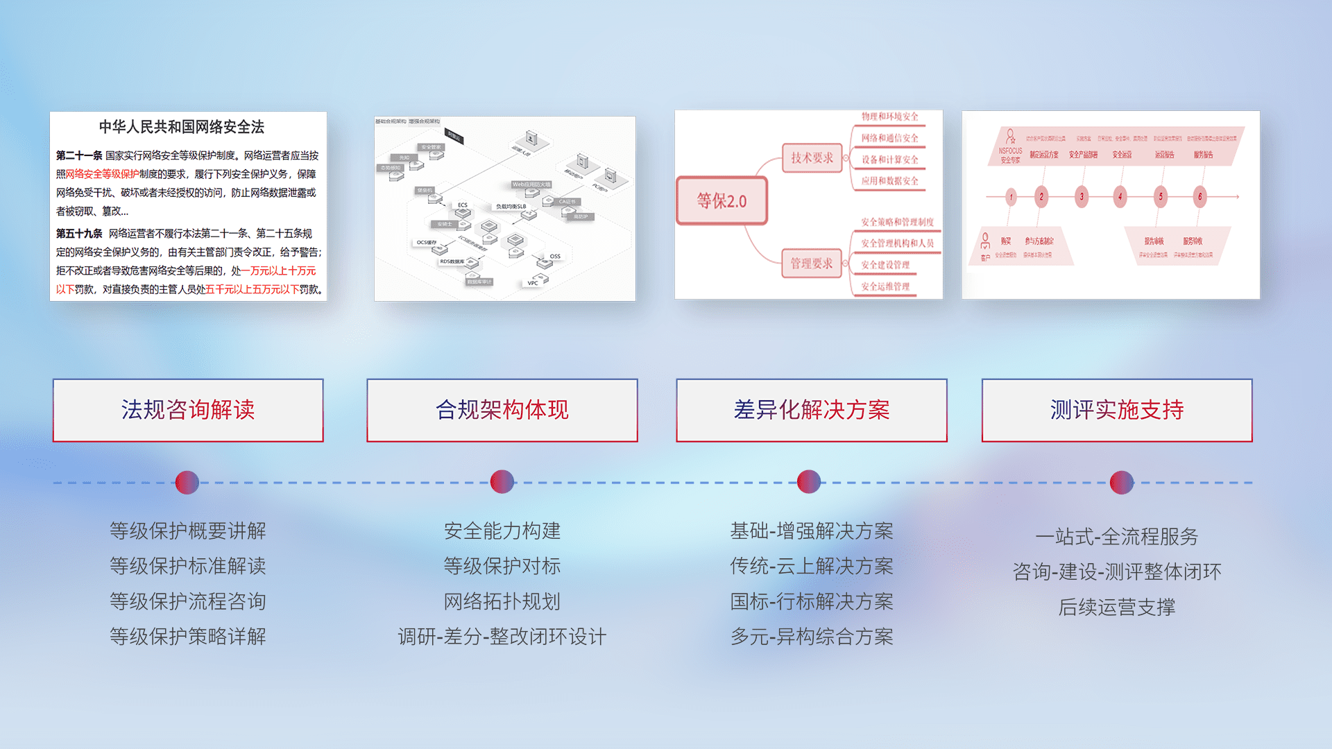 通过专业的法律咨询解读、、、、合规架构体现、、差异化解决方案、、、、测试实施支持等服务,,,,为客户量身打造等保合规体系。。